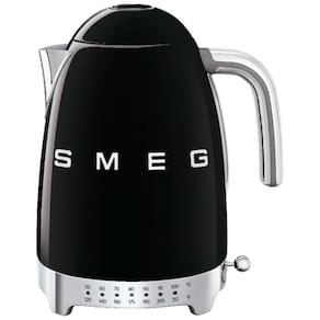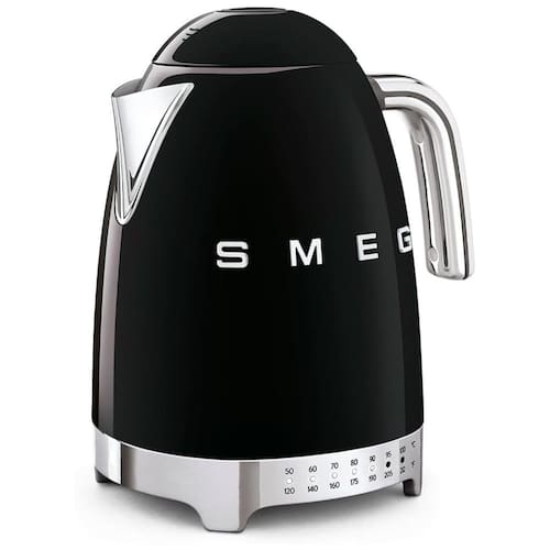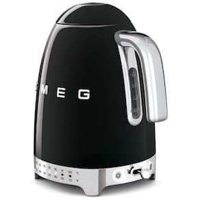 Chaleira elétrica SMEG KLF04BLUS com capacidade de 1.7L (7 xícaras), desligamento automático, display de temperatura LED, tampa de abertura suave, base giratória 360° e filtro de calcário removível.Características