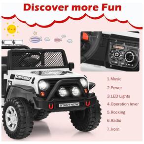 Dois modos de controle 1. Pedais e volante são uma maneira de as crianças dirigirem o carro. 2. O uso do controle remoto parental bateria AAA de 1,5 V não incluída é o contrário. E o último substitui o primeiro. Além disso, há uma alça embaixo do carro para facilitar a movimentação, caso você esqueça de carregar o suficiente na noite passada. Um passeio e suave este caminhão de passeio de 12V possui suspensão de mola dianteira e traseira e uma função de partida lenta para garantir um tempo de reprodução em quase todos os terrenos. Sempre coloque seus filhos no cinto de segurança quando eles entrarem no carro e o amplo assento garante que o passeio seja confortável e alegre. Experiência de condução realista com portas que podem ser abertas, janela frontal de grade ou volante, todos os detalhes requintados são imitados do caminhão real. O carro anda para frente e para trás, e também tem um modo de balanço. Nosso brinquedo de carro ruge quando você liga, as buzinas podem apitar e, com as luzes LED piscando, seu pequeno piloto recebe um passeio o mais realista possível. Opções de música e áudio Com música, este carro de passeio consegue trazer mais alegria para as crianças. Sistema de controle integrado ao equipamento para aumentar muito mais prazer. MP3, saída USB, funções que significam conectar outros dispositivos de música ou conectar telefones para obter mais opções de áudio para a preferência de seus filhos Marca: Não Informado