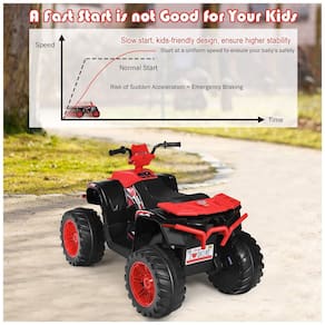 Condução Realista e Confortável Equipado com um potente motor de 12V, o quadriciclo proporciona desempenho estável e emocionante. Possui pedal acelerador, função de avanço e ré, além de duas opções de velocidade (alta e baixa), alcançando até 5 km/h. O assento amplo e ergonômico se ajusta perfeitamente ao corpo da criança, garantindo conforto durante as aventuras.