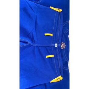 Calça: Confeccionada em tecido leve e resistente, com reforço nos joelhos e costuras duplas ou triplas, acompanhando o mesmo detalhe das linhas roxas. Calça em Rip-Stop 55% algodão e 45% poliéster