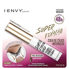 Cola incolor à prova d'água para cílios postiços. Kiss New York i-Envy Super Fixação 48h Incolor fixa de maneira resistente e com acabamento imperceptível, sem deixar marcas. Sua fórmula é potente, o que garante até 48 horas de aderênica.