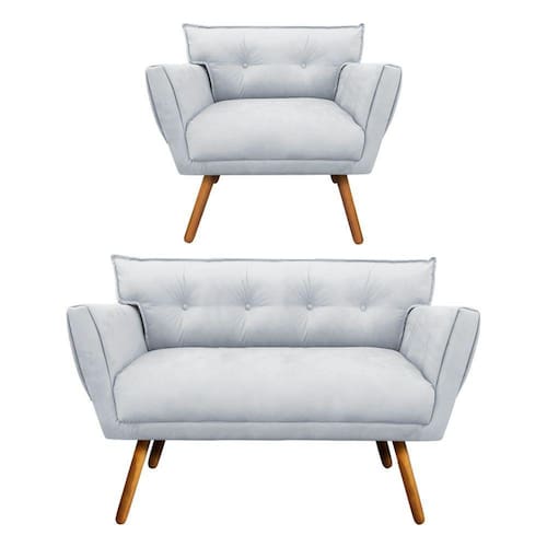 O Kit Namoradeira e poltrona Anitta é sofisticada e tem muito alto astral. Possui um encosto super fofo que no primeiro momento ao sentar você terá a sensação de estar sendo abraçado! Uma combinação perfeita para os ambientes modernos e também para os espaços neutros e tradicionais deixando-os mais leves e descontraídos. A almofada do encosto é fixa e utilizamos fibra siliconada para dar toda maciez e conforto, no assento utilizamos a espuma D-23. Dimensões Namoradeira: Altura total: 80 cm Largura total: 120 cm Profundidade total: 63 cm Altura do encosto: 36 cm Largura do assento: 100 cm Profundidade do assento: 49 cm Altura do chão ao assento: 45 cm Espessura do assento: 15 cm Tamanho dos pés: 30 cm Altura do chão ao braço: 64 cm Altura interna do braço: 20 cm Espessura do braço: 10 cm Peso: 21 kg Poltrona: Altura total: 80 cm Largura total: 78 cm Profundidade total: 65 cm Altura do encosto: 37 cm Largura do assento: 54 cm Profundidade do assento: 46 cm Altura do chão ao assento: 48 cm Espessura do assento: 18 cm Tamanho dos pés: 30 cm Altura do chão ao braço: 63 cm Altura interna do braço: 18 cm Espessura do braço: 10 cm Peso: 12 kg Especificações do Produto Estrutura: Madeira Eucalipto Espuma: D-23 Tecido: Suede (100% Poliéster) Tipo de pés: Pés palito Peso Suportado: Até 120 kg Garantia: 90 dias contra defeito de fabricação Montagem: O produto vai montado, apenas rosquear os pés Instruções de Limpeza: Utilizar um pano limpo e levemente úmido Você irá receber: 02 volumes com 01 namoradeira e 01 poltrona Observações Relevantes - Todos os produtos vão embalados com total segurança; - As cores dos produtos podem sofrer alterações dependendo do seu monitor; - Para futuras compras, não garantimos a mesma tonalidade de cor, pois existe variação a cada lote do fabricante do tecido; - As imagens são meramente ilustrativas, não acompanham objetos de decoração e eletros; - Confira as dimensões do produto no momento da compra e certifique-se de que passará normalmente por escadas, elevadores, portas e corredores; - Importante: Por se tratar de estofado as medidas podem ter uma pequena variação em até 3 cm; - Não nos responsabilizamos no ato da entrega por montagens, desmontagens, instalações de produtos; - Não nos responsabilizamos no ato da entrega por subir escadas, elevadores, nem utilização de guinchos ou equipamentos similares para acesso a pisos superiores em apartamentos; - A entrega do produto é realizada em todo território nacional, até onde as rodovias alcançam, entregas fluviais ou aéreas devem ser cotadas a parte; - Observando as orientações acima, evita-se futuros desagrados ou imprevistos com a entrega do produto. Havendo despesas adicionais, serão de responsabilidade do cliente;