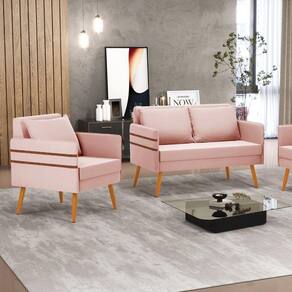 Que tal o kit Namoradeira e Poltrona Mari? Imagine-se utilizando esse kit e usufruindo de todos os benefícios que ele oferece. Pode ser utilizado para evidenciar e enriquecer o seu ambiente, descansar depois de um dia longo de trabalho, ver aquela série favorita ou simplesmente ler seu livro predileto. A estrutura deste conjunto é confeccionada em madeira de eucalipto proveniente de reflorestamento, suportando em média até 120 Kg, possuí pés palito castanho, garantindo uma maior resistência e durabilidade ao produto, o estofamento do assento e encosto é composto de espuma D-23, revestido em tecido Veludo no tom Rosê. Então, se a sua dificuldade é a otimização de espaço, este Kit além de confortável e sofisticado, traz toda a funcionalidade que você precisa. Apenas alguns conjuntos estão disponíveis, separe o seu Kit 01 Namoradeira e 01 Poltrona Mari antes que acabem!
