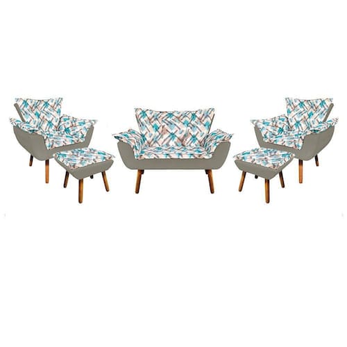 Chegou para vocês o Kit 01 Namoradeira com 02 Poltronas e 02 Puffs Opala! Sua neutralidade permite que você tenha total liberdade para combinar com as cores que quiser, criando um visual exclusivo e original. O seu interior é estruturado em madeira reflorestada de eucalipto e sua base é de MDF reforçada, com pés de madeira, já no encosto é utilizado no a espuma D-23, revestidos em um tecido de ótima qualidade. Ao escolher a maravilhosa Opala você permite causar boas impressões, fazendo seu próprio estilo! Sendo feita a junção desses móveis, ficará incrível qualquer lugar em que escolher colocá-los! Não fique por fora dessa oportunidade única de ter o Kit Opala em sua casa! Dimensões da Namoradeira Altura total: 91 cm Largura total: 128 cm Profundidade total: 62 cm Altura do encosto: 48 cm Largura do assento: 88 cm Profundidade do assento: 46 cm Altura do chão ao assento: 47 cm Espessura do assento: 17 cm Tamanho dos pés: 30 cm Altura do chão ao braço: 65 cm Altura interna do braço: 18 cm Espessura do braço: 20 cm Peso: 22 kg Dimensões da Poltrona Altura total: 91 cm Largura total: 80 cm Profundidade total: 67 cm Altura do encosto: 46 cm Largura do assento: 40 cm Profundidade do assento: 46 cm Altura do chão ao assento: 46 cm Espessura do assento: 16 cm Tamanho dos pés: 30 cm Altura do chão ao braço: 63 cm Altura interna do braço: 23 cm Espessura do braço: 20 cm Peso: 14 kg Dimensões do Puff Altura: 45 cm Largura: 50 cm Profundidade: 40 cm Peso: 5 KG Especificações do Produto Estrutura da Poltrona: Madeira Eucalipto Tecido: Suede (100% Poliéster) Estampado (100% Poliéster) Tipo de pés: Palito de Madeira Peso Suportado: Namoradeira até 240 Kg, a Poltrona e Puff até 120 Kg Garantia: 90 dias contra defeito de fabricação Montagem: O produto vai montado, apenas rosquear os pés. Instruções de Limpeza: Utilizar um pano limpo e seco Você irá receber: 05 volumes Observações Relevantes