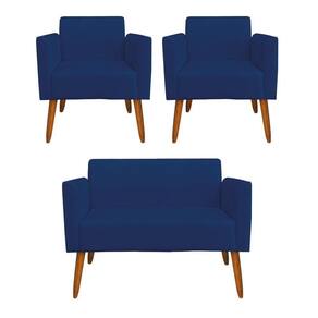 Kit 01 Namoradeira e 02 Poltronas Marisa Suede Azul Marinho Pés Palito Castanho D'Rossi