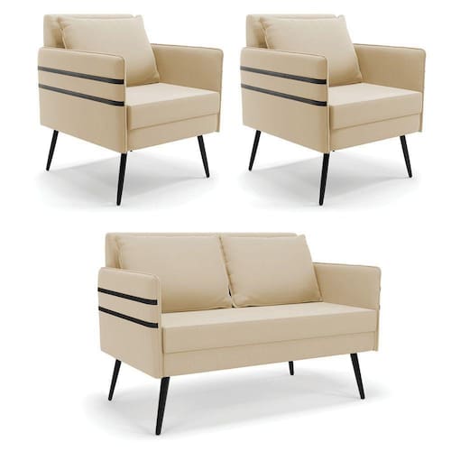 Que tal o kit Namoradeira e Poltrona Mari? Imagine-se utilizando esse kit e usufruindo de todos os benefícios que ele oferece. Pode ser utilizado para evidenciar e enriquecer o seu ambiente, descansar depois de um dia longo de trabalho, ver aquela série favorita ou simplesmente ler seu livro predileto. A estrutura deste conjunto é confeccionada em madeira de eucalipto proveniente de reflorestamento, suportando em média até 120 Kg, possuí Pés Palito de Ferro, garantindo uma maior resistência e durabilidade ao produto, o estofamento do assento e encosto é composto de espuma D-23, revestido em tecido Suede no tom Bege. Então, se a sua dificuldade é a otimização de espaço, este Kit além de confortável e sofisticado, traz toda a funcionalidade que você precisa. Apenas alguns conjuntos estão disponíveis, separe o seu Kit 01 Namoradeira e 02 Poltronas Mari antes que acabem! Dimensões da Namoradeira: Altura total: 82 cm Largura total: 110 cm Profundidade total: 74 cm Altura do encosto: 35 cm Largura do assento: 104 cm Profundidade do assento: 57 cm Altura do chão ao assento: 47 cm Espessura do assento: 22 cm Altura do chão ao braço: 46 cm Altura interna do braço: 19 cm Tamanho dos pés: 25 cm Espessura do braço: 4 cm Peso: 20 kg Dimensões da Poltrona: Altura total: 82 cm Largura total: 63 cm Profundidade total: 74 cm Altura do encosto: 51 cm Largura do assento: 54 cm Profundidade do assento: 57 cm Altura do chão ao assento: 47 cm Espessura do assento: 22 cm Altura do chão ao braço: 46 cm Altura interna do braço: 19 cm Tamanho dos pés: 25 cm Espessura do braço: 4 cm Peso: 15 kg Dimensões da Almofada: Altura total: 34 cm Largura total: 51 cm Profundidade total: 20 cm Peso: 0,3 kg Especificações do Produto Estrutura: Madeira Eucalipto Espuma: D-23 Tecido: Suede Tipo de pés: Pés Palito de Ferro Peso suportado: Até 120 Kg Garantia: 90 dias contra defeito de fabricação Montagem: O produto vai montado, apenas rosquear os pés Instruções de limpeza: Utilizar um pano limpo e levemente úmido Você irá receber: 03 Volumes com 01 Namoradeira e 02 Poltronas Observações Relevantes - Todos os produtos vão embalados com total segurança; - As cores dos produtos podem sofrer alterações dependendo do seu monitor; - Para futuras compras, não garantimos a mesma tonalidade de cor, pois existe variação a cada lote do fabricante do tecido; - As imagens são meramente ilustrativas, não acompanham objetos de decoração e eletros; - Confira as dimensões do produto no momento da compra e certifique-se de que passará normalmente por escadas, elevadores, portas e corredores; - Importante: Por se tratar de estofado as medidas podem ter uma pequena variação em até 3 cm; - Não nos responsabilizamos no ato da entrega por montagens, desmontagens, instalações de produtos; - Não nos responsabilizamos no ato da entrega por subir escadas, elevadores, nem utilização de guinchos ou equipamentos similares para acesso a pisos superiores em apartamentos; - A entrega do produto é realizada em todo território nacional, até onde as rodovias alcançam, entregas fluviais ou aéreas devem ser cotadas a parte; - Observando as orientações acima, evita-se futuros desagrados ou imprevistos com a entrega do produto. Havendo despesas adicionais, serão de responsabilidade do cliente;