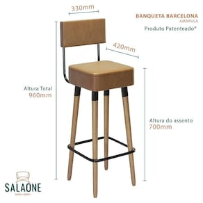 A banqueta Barcelona, possui 04 pés de madeira eucalipto com 70 cm de altura, e encosto estruturado, com seu design moderno, pode ser utilizado em sua área gourmet, área externa.
