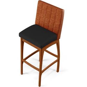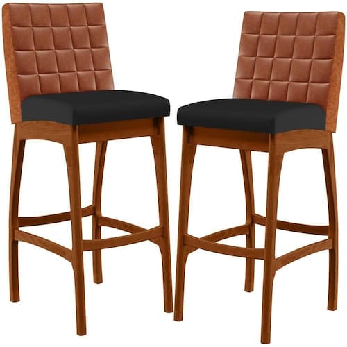 ndo muita excelência, o Kit 02 Banquetas Altas Cozinha Sala Jantar Fixa Mila B04 Couríssimo Camel Corano Preto - Lyam Decor é o complemento que faltava para deixar sua casa ainda mais extraordinária. Seu encosto com costura em padrão quadriculado e assento estofados, centralizam em si uma graciosidade estonteante, sem perder todo o conforto. A estrutura em madeira, na cor nozes, também é digna de notoriedade, por imprimir bastante personalidade a sua decoração. Vale ressaltar ainda, o apoio para os pés que garante maior segurança à banqueta.