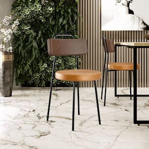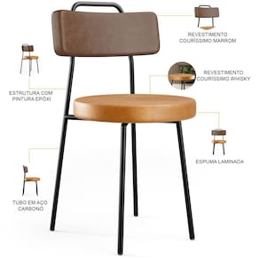 Revestimento do encosto em Couríssimo na cor Marrom e assento em Couríssimo na cor Whisky, com acabamento semi brilho.