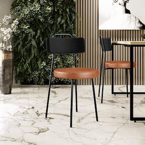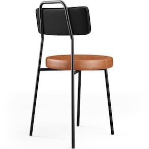 Revestimento do encosto em Couríssimo na cor Preto e assento em Couríssimo na cor Camel, com acabamento semi brilho.