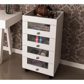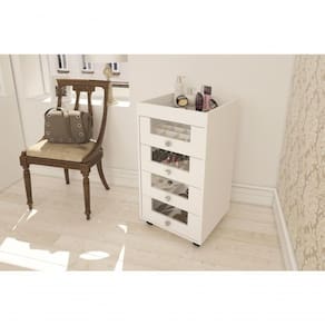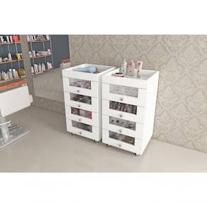 Kit Com 02 Carrinhos Organizador de Maquiagem PE2009, perfeito para você organizar seus itens de maquiagem, perfumes, escovas e acessórios em um só lugar, estrutura resistente em MDP de 15mm, pintura com acabamento em Uv (Brilho). Conta com uma bandeja no topo da peça que deixa tudo mais a mão, são gavetas com corrediças telescópicas com fechamento leve e suave, divisores internos setorizados para organizar seus itens de forma super funcional, assim você terá muito mais praticidade ao escolher seu item, possui quatro rodizios que deslizam com facilidade, a frente das gavetas são de vidro tornando possivel enxergar oque você precisa com mais rapidez, puxadores são modernos e cromados, esta peça é ideal para seus acessórios de beleza mas você pode usar sua imaginação e usar no ambiemte que precisar. Estes móveis chegarão em sua casa separados em 02 volumes.