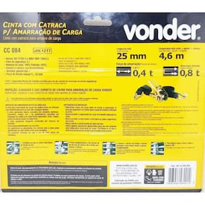 Kit 02 Cinta Catraca Com Amarraçao Carga 800kg CC084 VonderCinta com Catraca para Amarração de Carga 0,8 toneladas/0,4 toneladas. CC 084 VONDERIndicada para amarração de cargas. Proibido uso de alavanca no punho da catraca móvel. Proibido uso para içamento de cargas.Possui gancho tipo J. Catraca e gancho fabricados em aço bicromatizado, proporcionando boa resistência à oxidação.Conteúdo da Embalagem:2 Jogos, cada jogo composto por: 1 cinta, 2 ganchos e 1 catracaDescrição Técnica:Código: 80.14.250.800Carga de trabalho da cinta em amarração enlaçada: 0,80tCarga de trabalho da cinta em amarração direta: 0,40tFator de segurança da cinta para amarração de carga: 2:1Força de tensão manual: 25daNForça de tensão nominal: 80daNLargura da cinta: 25,0mmComprimento total do conjunto da cinta para amarração de carga: 4,6mComprimento da cinta ajustável: 4,1mComprimento da cinta fixa: 0,5mAlongamento total da cinta: Máximo 7%Material dos acessórios da cinta para amarração de carga: Aço BicromatizadoMaterial da cinta: 100% Poliéster (PES)Carga de ruptura da cinta para amarração de carga: 1,6 toneladasNorma de referência da cinta: EN 121952 e ABNT NBR 158832Cor da cinta: PretaGarantia E (CDC): Garantia legal: 90 diasPeso - 810gCódigo de Barras: 7893946489014