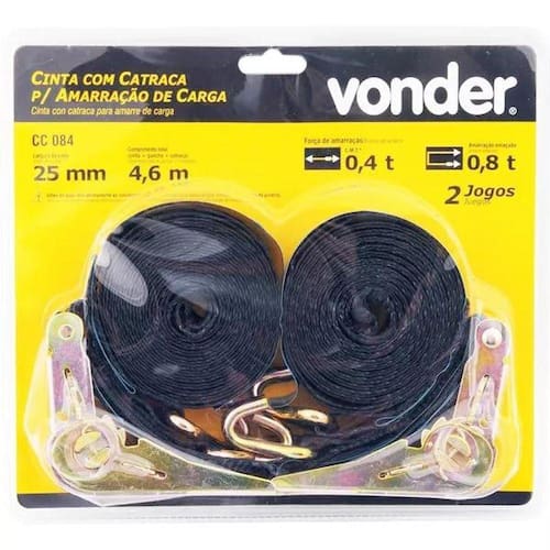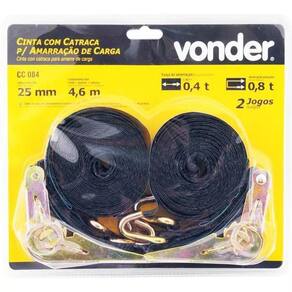Kit 02 Cinta Catraca Com Amarraçao Carga 800kg CC084 VonderCinta com Catraca para Amarração de Carga 0,8 toneladas/0,4 toneladas. CC 084 VONDERIndicada para amarração de cargas. Proibido uso de alavanca no punho da catraca móvel. Proibido uso para içamento de cargas.Possui gancho tipo J. Catraca e gancho fabricados em aço bicromatizado, proporcionando boa resistência à oxidação.Conteúdo da Embalagem:2 Jogos, cada jogo composto por: 1 cinta, 2 ganchos e 1 catracaDescrição Técnica:Código: 80.14.250.800Carga de trabalho da cinta em amarração enlaçada: 0,80tCarga de trabalho da cinta em amarração direta: 0,40tFator de segurança da cinta para amarração de carga: 2:1Força de tensão manual: 25daNForça de tensão nominal: 80daNLargura da cinta: 25,0mmComprimento total do conjunto da cinta para amarração de carga: 4,6mComprimento da cinta ajustável: 4,1mComprimento da cinta fixa: 0,5mAlongamento total da cinta: Máximo 7%Material dos acessórios da cinta para amarração de carga: Aço BicromatizadoMaterial da cinta: 100% Poliéster PES Carga de ruptura da cinta para amarração de carga: 1,6 toneladasNorma de referência da cinta: EN 121952 e ABNT NBR 158832Cor da cinta: PretaGarantia E CDC : Garantia legal: 90 diasPeso - 810gCódigo de Barras: 7893946489014