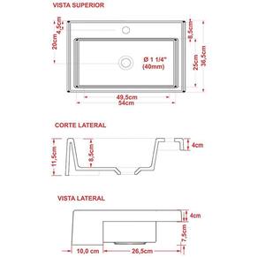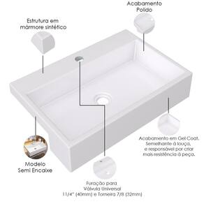 Estrutura em Mármore Sintético com acabamento Hard Lacca PU, semelhante a louça e responsável por criar mais resistência a peça. Acabamento Brilho. Furação da Cuba: Acabamento Torneira: 7/8 (32mm) - Válvula: 1 1/4 (40mm) Acabamento Polido. Formato: Retangular. Modelo: Semi Encaixe.Importante: O produto é enviado montado, requerendo apenas instalação por parte do cliente.