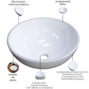 Estrutura em Mármore Sintético com acabamento Hard Lacca PU, semelhante a louça e responsável por criar mais resistência a peça. Acabamento Brilho. Furação da Cuba: Acabamento Válvula Universal: 1 1/4 (40mm) e 7/8 (32mm). Formato: Redondo. Modelo: Apoio.Importante: O produto é enviado montado, requerendo apenas instalação por parte do cliente.