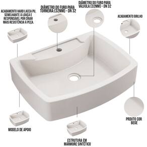 Estrutura em Mármore Sintético com acabamento Hard Lacca PU, semelhante a louça e responsável por criar mais resistência a peça.