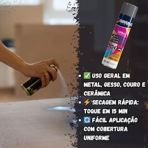 Tinta Spray 400ml Cinza Grafite Uso Geral em Aço Ferro Couro Gesso Cerâmica A Tinta Spray 400ml Cinza Grafite Uso Geral é a solução prática para renovar superfícies de metal, gesso, couro e cerâmica. Ideal para dar vida nova a bicicletas, móveis, eletrodomésticos e objetos em geral, garantindo um acabamento moderno e duradouro. Com fórmula de alta qualidade, oferece excelente aderência e acabamento Brilhante, além de resistência superior contra desgastes do dia a dia. Sua cobertura uniforme realça os detalhes e proporciona um resultado em poucas camadas. Prática e fácil de aplicar, a tinta spray seca ao toque em apenas 15 minutos, permitindo agilidade nos trabalhos e economia de tempo. O rendimento de até 2 m por demão garante maior aproveitamento do produto e ótimo custo-benefício. Diferenciais: Acabamento Brilhante com ótima aderência Alta durabilidade e resistência em ambientes internos e externos Secagem rápida e aplicação prática com cobertura uniforme Especificações TÉCNICAS: Volume: 400ml Rendimento: até 2 m por demão Superfícies indicadas: metal, gesso, couro e cerâmica Secagem: toque em 15 minutos Acabamento: Brilhante Recomendação: uso de primer para melhor desempenho Itens INCLUSOS: 02 Tintas Spray 400ml Cinza Grafite Uso Geral Marca: Não Informado Ean: 7894141437909