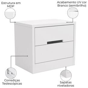 Mesas de Cabeceira S822, solução funcional para quartos com design moderno! Estrutura em MDP (15mm) com acabamento em pintura UV. Gavetas usinadas, corrediças telescópicas e sapatas niveladoras para maior facilidade no dia a dia, sendo prática e compacta. Estes produtos serão entregues em 02 volumes.