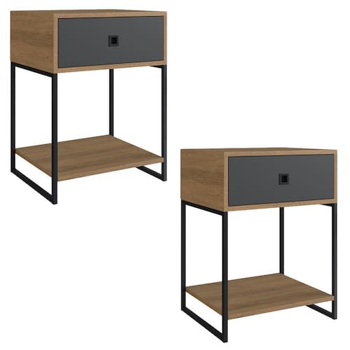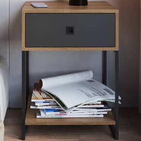 Kit 02 Mesas De Cabeceira Estilo Industrial 01 Gaveta P1026, design em alta e espaço para que os itens que você necessita ao lado de sua cama estejam sempre à mão. Possui estrutura em aço e MDP de 15 mm, gavetas com puxadores embutidos e corrediças metálicas, cada mesa dispõe também de prateleira inferior para seus objetos, suas bases possuem proteção em plástico, evitando riscos no chão de seu cômodo. Com suas texturas exclusivas, este conjunto irá agregar aconchego e praticidade à seu quarto. Estes móveis chegarão na sua casa separados em 02 volumes.