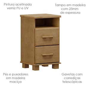 Apresentamos o Kit de 02 Mesas de Cabeceira, que combina funcionalidade e elegância para o seu ambiente. Produzida com madeira maciça de pinus de reflorestamento, garante qualidade e durabilidade. A pintura acetinada em verniz PU e UV oferece um acabamento suave e resistente, realçando a beleza natural da madeira enquanto protege contra desgastes do dia a dia. O design funcional conta com 02 gavetas equipadas com corrediças telescópicas, que proporcionam um deslizamento suave e sem esforço. O nicho adicional oferece mais opções de organização, ideal para livros ou objetos decorativos. O tampo em madeira de 25mm de espessura confere robustez e sofisticação ao design, enquanto os puxadores e pés em madeira maciça garantem um toque natural e refinado, que harmoniza perfeitamente com qualquer decoração. Este móvel chegará em sua casa separado em 02 volumes.