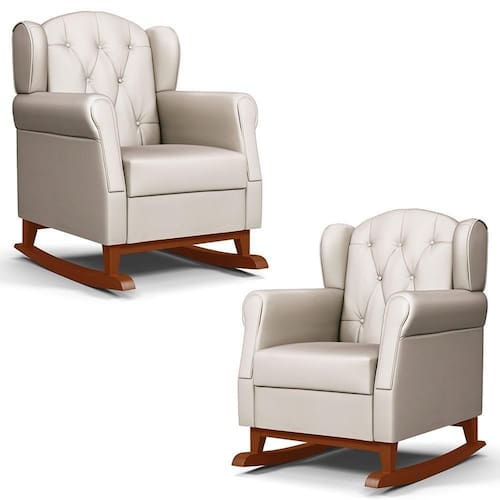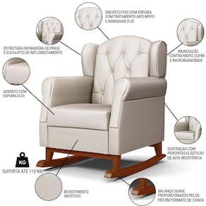O Kit 02 Poltronas Amamentação Base Madeira Balanço Lucy P04 Sintético Bege Mpozenato é a escolha ideal para as mamães que buscam conforto, beleza e qualidade. Ela possui uma estrutura de madeira de reflorestamento com imunização contra mofo, cupim e microrganismos, garantindo maior durabilidade e resistência. A sustentação do assento e encosto é feita com percintas elásticas que proporcionam mais maciez e ergonomia. O Tecido Sintético é fácil de limpar e tem um toque suave na pele. A base canoa com balanço permite um movimento suave e relaxante, ideal para ninar o bebê ou descansar após um dia cansativo. A poltrona tem um design moderno e elegante que combina com qualquer ambiente. Ela está disponível em para você escolher a que mais combina com o seu estilo. Não perca essa oportunidade de ter uma Poltrona de Amamentação e Descanso na sua casa. Você vai se surpreender com o conforto e a qualidade dessa poltrona. Compre já!