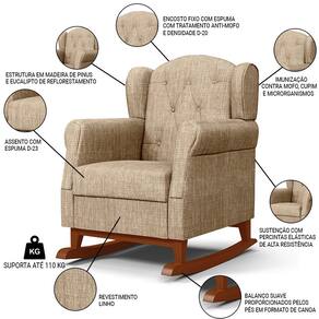 Características do Produto: Material da Estrutura: Madeira Eucalipto/Pinus de Reflorestamento. Material da Espuma: Poliuretano. Tipo de Espuma: D-20 e D-23. Peso Suportado: 110 kg. Revestimento: Linho. Tipo de Encosto: Fixo. Tipo de Assento: Fixo. Tipo de Base: Canoa Balanço. Material da Base: Madeira. Quantidade de Lugares: 1 Lugar.