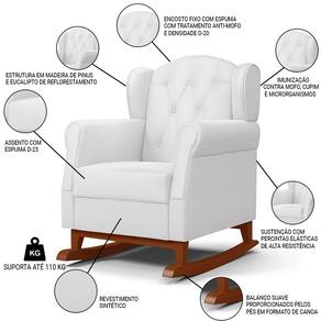 O Kit 02 Poltronas de Amamentação Base de Madeira Balanço Lucy P04 Sintético Branco - Mpozenato é a escolha ideal para as mamães que buscam conforto, beleza e qualidade. Ela possui uma estrutura de madeira de reflorestamento com imunização contra mofo, cupim e microrganismos, garantindo maior durabilidade e resistência. A sustentação do assento e encosto é feita com percintas elásticas que proporcionam mais maciez e ergonomia. O Tecido Sintético é fácil de limpar e tem um toque suave na pele. A base canoa com balanço permite um movimento suave e relaxante, ideal para ninar o bebê ou descansar após um dia cansativo. A poltrona tem um design moderno e elegante que combina com qualquer ambiente. Ela está disponível em várias cores para você escolher a que mais combina com o seu estilo. Não perca essa oportunidade de ter uma Poltrona de Amamentação e Descanso na sua casa. Você vai se surpreender com o conforto e a qualidade dessa poltrona. Compre já!
