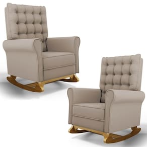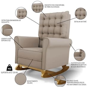 As Poltronas de Balanço são feitas com materiais de alta qualidade, estrutura em madeira de eucalipto, o tecido Veludo macio e resistente, e a espuma D23 a densidade ideal para o seu conforto, base em madeira com um lindo design e balanço suave, que ajuda a relaxar e a embalar o sono do seu bebê. Além disso, o Kit 2 Poltronas possui um design moderno e sofisticado, com detalhes em botonê revestido no encosto, que dão um toque de charme e elegância ao ambiente.