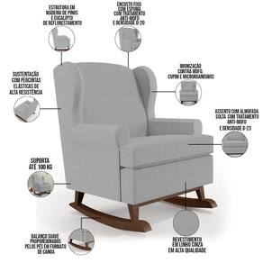 Características: Estrutura em madeira de pinus e eucalipto de reflorestamento, com imunização contra mofo, cupim e microrganismos; Revestimento em Linho Cinza de alta qualidade; Encosto fixo com percintas elásticas, espuma D-23 e tratamento antimofo; Assento com espuma D-20, tratamento antimofo e almofada solta; Sustentação com percintas elásticas de alta resistência; Base com pés em formato de canoa e balanço suave; Peso suportado: Até 100 kg.