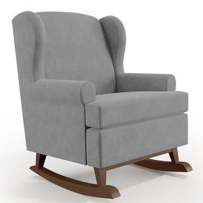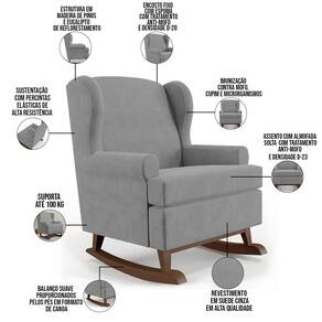 Características: Estrutura em madeira de pinus e eucalipto de reflorestamento, com imunização contra mofo, cupim e microrganismos; Revestimento em Suede Cinza de alta qualidade; Encosto fixo com percintas elásticas, espuma D-23 e tratamento antimofo; Assento com espuma D-20, tratamento antimofo e almofada solta; Sustentação com percintas elásticas de alta resistência; Base com pés em formato de canoa e balanço suave; Peso suportado: Até 100 kg.