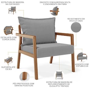 O Kit 02 Poltronas Decorativa Para Sala de Estar e Living Alícia B04 Bouclê Cinza é perfeito para adicionar um toque de estilo moderno a sua sala de estar. Com sua estrutura em madeira maciça envernizada, essa poltrona de madeira traz durabilidade e elegância para o ambiente. O assento estofado e revestido com materiais de qualidade oferece conforto excepcional, permitindo que você relaxe com estilo. Já o design moderno combina perfeitamente com qualquer tipo de decoração, tornando-a uma escolha versátil para qualquer sala de estar, living, recepção, escritório e diversos outros ambientes. A cereja do bolo fica por conta do detalhe da corda trançada no encosto com a almofada sobreposta, um charme à parte.