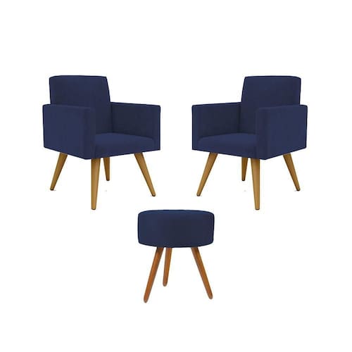 Kit 02 Poltronas Decorativas + Puff Decorativo Redondo Sala Cor:azul Marinho