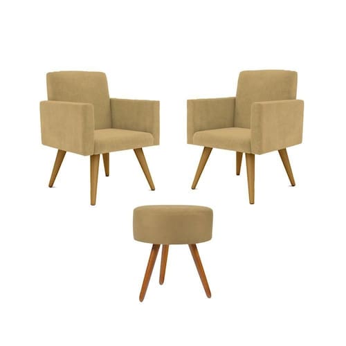 Kit 02 Poltronas Decorativas + Puff Decorativo Redondo Sala Cor:capuccino