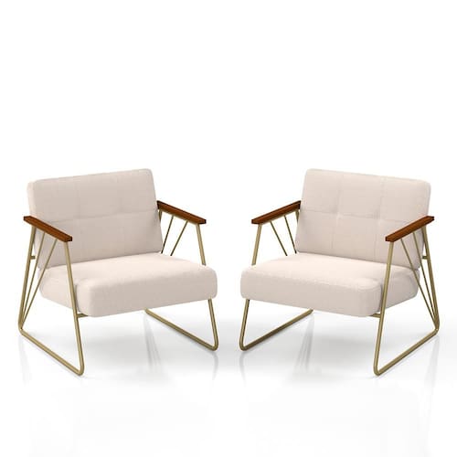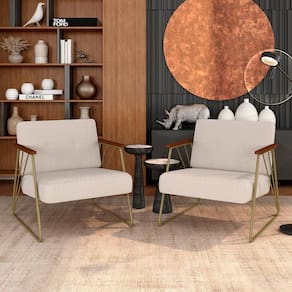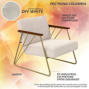 - Detalhes Técnicos das Poltronas - Assento e Encosto Tapeçados, Estofados e Fixos - Espuma do Assento e do Encosto: D20 - Tonalidade Estrutura: Dourado - Tonalidade Estofado: Bouclé Off White - Material: Metalon - Medida Poltrona: A:78CM x L:71CM x P:88CM - Altura do assento ao Chão: 42cm - Poltrona suporta até 120KG