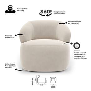 As percintas elásticas no assento aumentam a resistência e durabilidade, enquanto os braços, com espuma D-20, oferecem suporte adicional. A base em aço giratório e poliuretano da Poltrona Glee não só permite uma rotação suave, mas também acrescenta um toque moderno ao seu espaço.