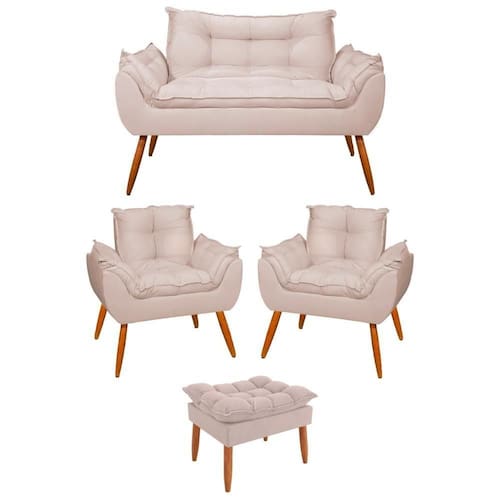 Você receberá 3 volumes, ou seja, duas Poltronas, uma Namoradeira e um Puff, todos do modelo Opala.