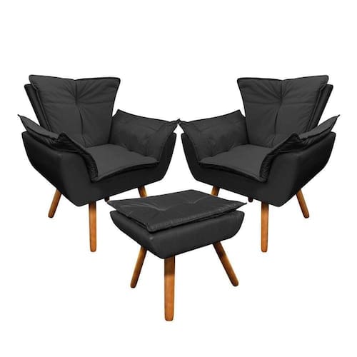 Se você estiver a procura de conforto para leitura e momentos de descanso a Poltrona Opala e o Puff é a melhor escolha. Com estilo inovador e moderno, a Poltrona Opala juntamente com o Puff são um empoderamento visual. Com elegância eles são feitos para preencher o ambiente de aconchego! O seu interior é estruturado em madeira reflorestada de eucalipto e sua base é de MDF reforçada, com pés de madeira castanhos, que dão o apoio necessário para que a Poltrona suporte até 120 kg e o Puff 80 kg. O encosto e o assento são fixos e utilizamos a espuma D-23. Poltrona e Puff Opala são os produtos que faltam em seu ambiente. Dimensões Poltrona: Altura total: 91 cm Largura total: 80 cm Profundidade total: 67 cm Altura do encosto: 46 cm Largura do assento: 40 cm Profundidade do assento: 46 cm Altura do chão ao assento: 46 cm Espessura do assento: 16 cm Tamanho dos pés: 30 cm Altura do chão ao braço: 63 cm Altura interna do braço: 23 cm Espessura do braço: 20 cm Peso: 14 kg 01 Puff: Altura: 45 cm Largura: 50 cm Profundidade: 40 cm Espessura do assento: 15 cm Tamanho dos pés: 30 cm Peso: 5 kg Especificações dos Produtos Estrutura: Madeira Eucalipto Espuma: Prorelax D-23 Tecido: Corino Tipo de pés: Pés palito Peso Suportado: Poltrona até 120 Kg e Puff até 80kg Garantia: 90 dias contra defeito de fabricação Montagem: O produto vai montado, apenas rosquear os pés Instruções de Limpeza: Utilizar um pano limpo e levemente úmido Você irá receber: 01 volume 02 Poltronas e 01 Puff Observações Relevantes - Todos os produtos vão embalados com total segurança; - As cores dos produtos podem sofrer alterações dependendo do seu monitor; - Para futuras compras, não garantimos a mesma tonalidade de cor, pois existe variação a cada lote do fabricante do tecido; - As imagens são meramente ilustrativas, não acompanham objetos de decoração e eletros; - Confira as dimensões do produto no momento da compra e certifique-se de que passará normalmente por escadas, elevadores, portas e corredores; - Importante: Por se tratar de estofado as medidas podem ter uma pequena variação em até 3 cm; - Não nos responsabilizamos no ato da entrega por montagens, desmontagens, instalações de produtos; - Não nos responsabilizamos no ato da entrega por subir escadas, elevadores, nem utilização de guinchos ou equipamentos similares para acesso a pisos superiores em apartamentos; - A entrega do produto é realizada em todo território nacional, até onde as rodovias alcançam, entregas fluviais ou aéreas devem ser cotadas a parte; - Observando as orientações acima, evita-se futuros desagrados ou imprevistos com a entrega do produto. Havendo despesas adicionais, serão de responsabilidade do cliente;