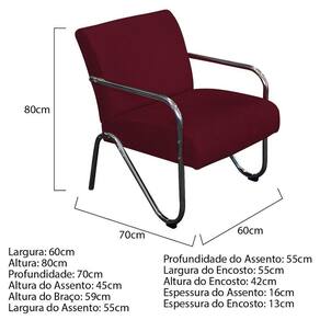 Gostaria de um móvel que trouxesse mais elegância e sofisticação para o seu lar? O Kit 02 Poltronas Sara é sua melhor opção! Com característica moderna e com acabamento de qualidade, este produto atenderá suas expectativas! Não perca essa oportunidade e adquira já a sua! Especificações Técnicas da Poltrona Decorativa Sara: - Altura: 80 cm; - Largura: 60 cm; - Profundidade: 70 cm; - Altura do Assento: 45 cm; - Altura do Braço: 59 cm; - Largura do Assento: 55 cm; - Profundidade do Assento: 55 cm; - Largura do Encosto: 55 cm; - Altura do Encosto: 42 cm; - Espessura do Assento: 16 cm; - Espessura do Encosto: 13 cm; - Peso: 10 kg. - Peso Suportado: 120 kg. Diferenciais da Poltrona Decorativa Sara: - Material da Estrutura: fabricado com Madeira Pinus e Eucalipto Reflorestada, e alguns detalhes em MDF; - Tipo de Assento: estofado e com espuma de densidade D-26; - Tipo de Encosto: estofado e com espuma de densidade D-18; - Detalhes dos Pés: pés e braços cromados, com alta resistência; - Volumes: nessa compra você receberá DUAS POLTRONAS. ATENÇÃO: a transportadora pode entregá-las juntas ou separadas, nesse último caso, inclusive com dias de diferença na entrega. Recomendações de limpeza: -Limpar com flanela limpa e seca. Não molhar o móvel e não expor em lugar úmido ou próximo de fontes de calor. Não usar produtos abrasivos. Observações Importantes: - As imagens ambientadas são meramente ilustrativas e podem apresentar itens que não compõe o produto; - Objetos decorativos que aparecem na foto não acompanham o produto; - As cores do produto podem variar de acordo com o monitor, a iluminação do ambiente, ou sua percepção visual; - A Poltrona Decorativa Sara chegará desmontada para você, bastando parafusar os pés; - Confira as dimensões antes da compra e certifique-se de que o produto passará por elevadores, portas e corredores, já que nossa entrega não inclui a subida de lances de escada, ou o lançamento de produtos; - Ao receber seus produtos, verifique no ato do recebimento qualquer dano na embalagem. Caso tenha alguma avaria, favor não assinar o comprovante de recebimento (A transportadora tem obrigação de esperar a conferência); - Produto para uso residencial em ambiente interno, não devendo ficar exposto diretamente ao sol, calor e umidades excessivas.