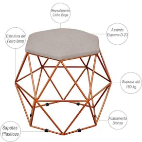 Descrição do produto: É fato que a decoração com itens aramados está super em alta, e é a responsável por mudar a decoração da casa! Esbanjando estilo, o Puff Six foge do tradicional e se destaca por sua modernidade e design de extremo bom gosto. Muito forte para o estilo de decoração glam ou também para áreas externas cobertas, este Puff Decorativo cai muito bem em ambientes como sala de estar, hall de entrada, recepções, ou onde mais sua imaginação permitir. Sua estrutura não desgasta no contato com o chão pois possui proteção com sapatas plásticas, além de um assento mega confortável. O seu mais novo queridinho do ambiente e cheio de charme Puff Six. :)