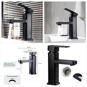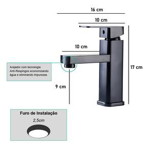 - Altura Total do Produto: 17 cm - Largura: 4 cm - Profundidade: 16 cm - Mecanismo | registro: ¼ de volta - Peso: 0.641 kg - Material Do Corpo: Aço Inoxidável - Pressão Mínima Para Funcionamento: MCA 4 - Pressão Máxima Para Funcionamento: MCA 40 - Vazão Mínima Para Funcionamento (L/min): 4 - Vazão Máxima Para Funcionamento (L/min): 13 - Arejador (Bica Fixa): Com Arejador Embutido - Acabamento: Preto Fosco - Área Indicada: Banheiro | Bancada | Mesa