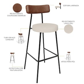 Revestimento do encosto em Couríssimo na cor Marrom e assento revestido em Linho na cor Cru, com acabamento semi brilho.