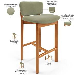 MaterialFamily: Madeira e Espuma | Altura do assento a partir do solo: 74 cm | Altura da cadeira: 83 cm | É cadeira de balanço: Não | OriginCountry: | ProductHeight: 83 cm | Cor: Oliva | Requer montagem: Não | Material: Madeira e Espuma | ProductInstructions: Produto para uso residencial em ambiente interno, não devendo ficar exposto diretamente ao sol, calo | Estilo: Clássico | Peso: 30 kg | Com apoio de braços: Não | Profundidade da cadeira: 47 cm | Cor do assento: Oliva | Diâmetro: na | Com estofado: Sim | Cor da estrutura da cadeira: Castanho | Profundidade do assento: 37 cm | Largura do assento: 45 cm | Fabricante: Lyam Decor | Espessura do assento: na | É dobrável: Não | ProductContents: 03 Banquetas | ProductWeight: 30 kg | ProductWarranty: 90 dias após o do produto | Com espaço de armazenamento: Não | Cor do estofamento: Oliva | SizeDescription: Altura: 83cm x Largura: 47cm x Profundidade: 47cm | Com rodas: Não | Largura: 47 cm | Color: Oliva | SupplierSimpleName: Kit 03 Banquetas Alta Para Cozinha Sala de Jantar Bar Dara L03 Bouclê Oliva - Lyam Decor | ProductLength: 47 cm | Peso máximo suportado: 150 Kg | Model: Banqueta Dara | OriginState: PR | ProductWidth: 47 cm | Tipo de produto: Banqueta | Material do estofamento: Bouclê | Quantidade de Caixas de embalagem: 1 | Desenho do tecido: Liso | É empilhável: Não | Largura da cadeira: 47 cm