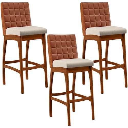 ndo muita excelência, o Kit 03 Banquetas Altas Cozinha Sala De Jantar Fixa Mila B04 Couríssimo Camel Linho Cru - Lyam Decor é o complemento que faltava para deixar sua casa ainda mais extraordinária. Seu encosto com costura em padrão quadriculado e assento estofados, centralizam em si uma graciosidade estonteante, sem perder todo o conforto. A estrutura em madeira, na cor nozes, também é digna de notoriedade, por imprimir bastante personalidade a sua decoração. Vale ressaltar ainda, o apoio para os pés que garante maior à banqueta.