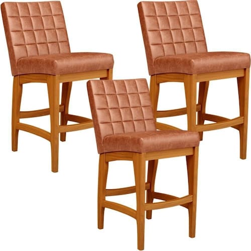 ndo muita excelência, o Kit 03 Banquetas Baixas Para Cozinha Bancada Bar Sala De Jantar 90 cm Fixa Mila L02 Couríssimo Camel - Lyam Decor é o complemento que faltava para deixar sua casa ainda mais extraordinária. Seu encosto com costura em padrão quadriculado e assento estofados, centralizam em si uma graciosidade estonteante, sem perder todo o seu conforto. A estrutura em madeira, na cor nozes, também é digna de notoriedade, por imprimir bastante personalidade a sua decoração. Vale ressaltar ainda, o apoio para os pés que garante maior segurança à mesma.