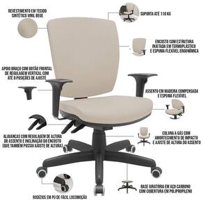 Assento em madeira compensada e estofado em espuma flexível, com coluna a gás e amortecimento de impacto.