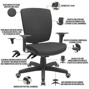 Assento em madeira compensada e estofado em espuma flexível, com coluna a gás e amortecimento de impacto.