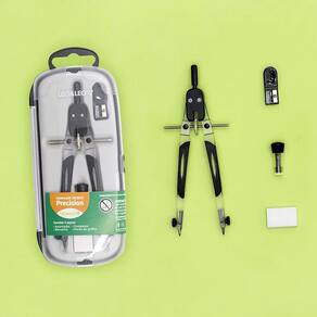 O Compasso Técnico Precision é um kit completo e ideal para seus trabalhos, atividades e projetos, ele vem com apontador, borracha e pontas extras de grafite.