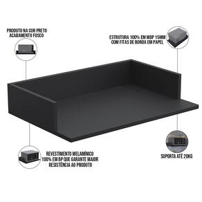 Características: Estrutura 100% em MDP 15mm. Fitas com borda de papel. Revestimento melamínico 100% em BP, que garante maior resistência ao produto. Suporta até 20Kg. Produto na Cor Preto, com acabamento Fosco.