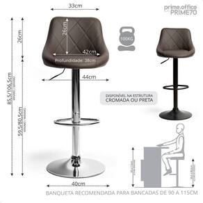 Sua estrutura em aço carbono está disponível em dois acabamentos refinados: preto fosco e cromado, garantindo resistência e durabilidade. O modelo é giratório em 360 e possui ajuste de altura de até 20 cm, permitindo adaptação perfeita à sua bancada.