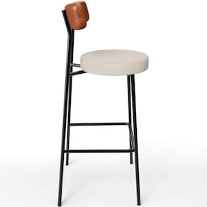 Revestimento do encosto em Couríssimo na cor Camel e assento revestido em Linho na cor Cru, com acabamento semi brilho.